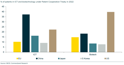 Looking at the number of patents filed worldwide, China is ahead of the US, with a share of 27% in 2022. Also, China has caught up strongly in patents on information and communication technology (ICT) and biotechnology (Exhibit 1).